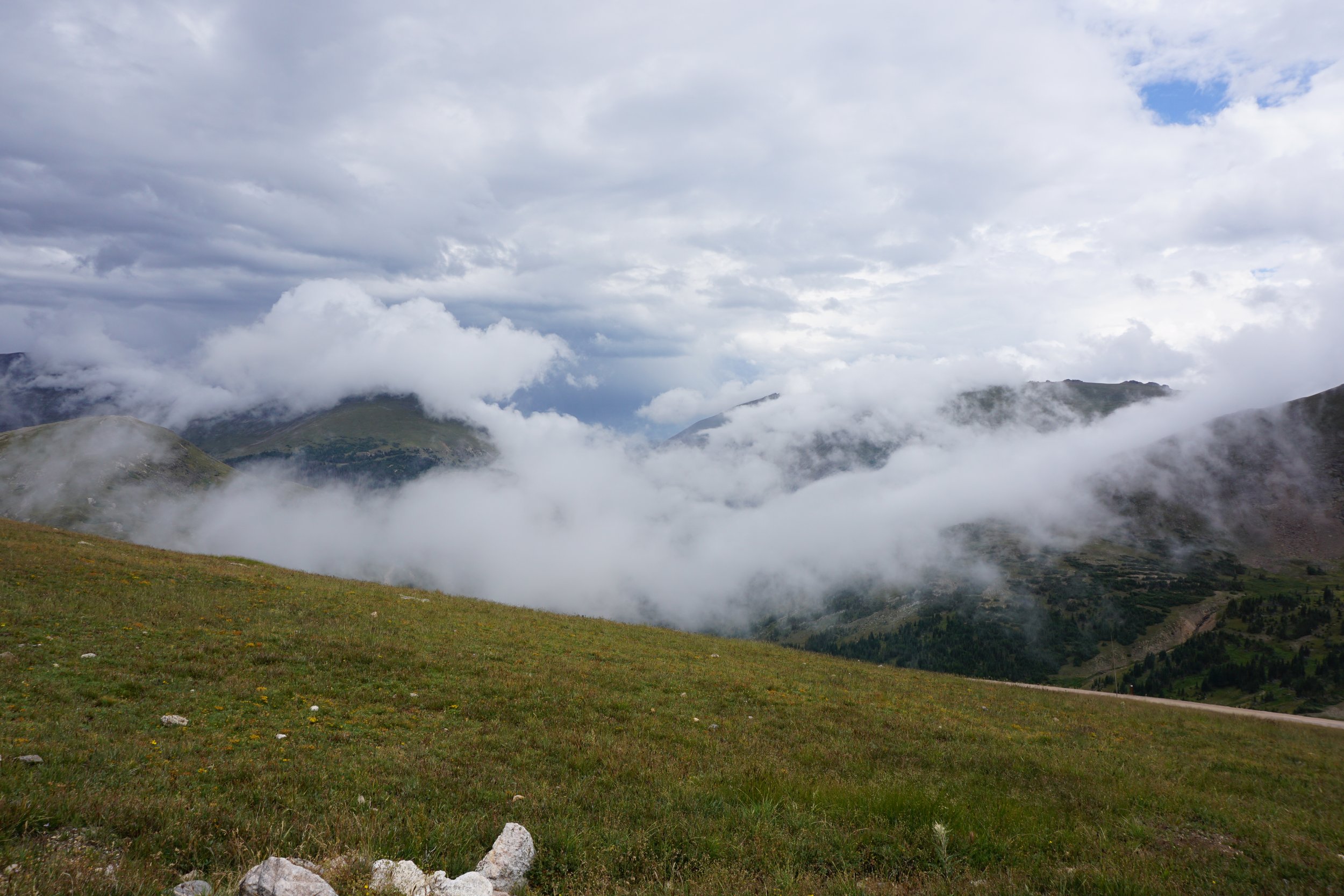 When I hiked this trail with my kiddo, the weather was stormy but stable. Rain and thunderstorms were moving in at lower elevations of the park but I felt safe hiking this short trail. We had planned to hike the longer Ute Trail along Tombstone Ridge, but I did not feel comfortable with even a 2 mile hike above treeline on this day. The short climb up Alpine Ridge felt just about right. It was very cold and a cloud moved in on us almost immediately. Our views were cut off so we never got the 360 degree view from the top but my little one got a kick out of hiking in a cloud…so is hiking above treeline…