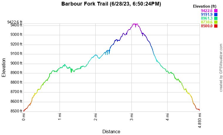 Follow the road for about 1,000 feet to a beautiful meadow with nice views of the surrounding slopes, plentiful aspen trees, and fields of wildflowers. The Barbour Fork Trailhead can be found off to the right.