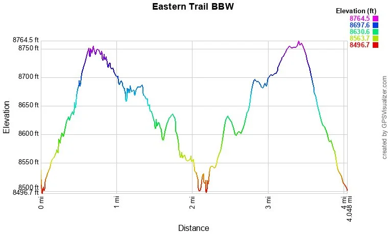 After the clearing the trail gets a little steeper as you pass through a forested area and gain a crest before another clearing. At this clearing, you'll see a double track trail heading off to the east. This is the Eastern Trail.