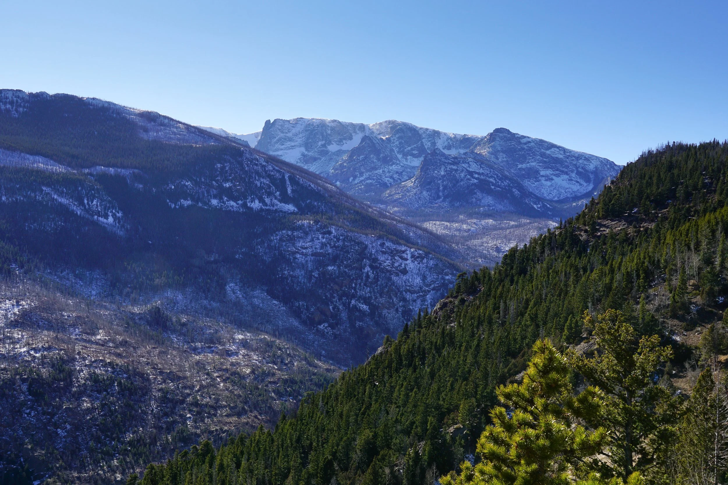 After this junction, things get a bit more remote and primitive. The trail gets steeper as it crosses through a burn area. The trail is very close to the edge of a valley and you get glimpses of the valley as you hike. At the bottom of the valley is the trail that leads to Fern Lake and the iconic mountains beyond, such as Notchtop, Knobtop, and Gabletop…the three tops…you’ll get better views at the hikes turnaround point. As you near the turn around spot, you’ll hike through a mini-canyon with rock formations on both sides. There are some opportunities at the top of the canyon to find easy rock outcroppings to climb for great views, explore as your comfort level permits.
