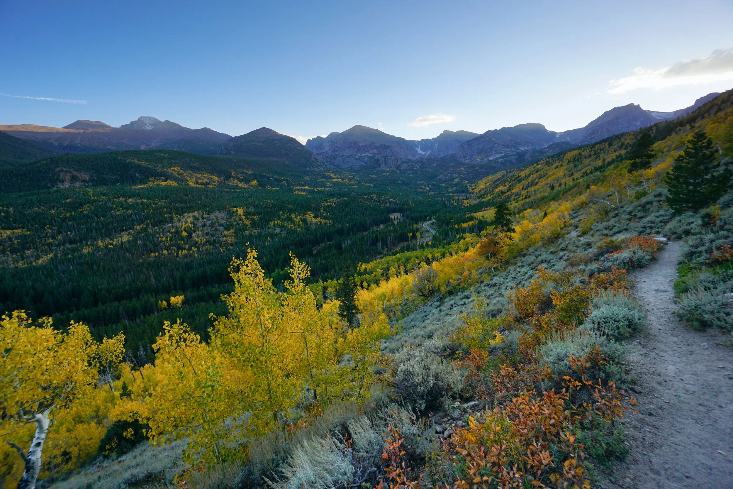 First of all, the initial mile of the hike follows well designed switchbacks up to the forested bench that the lake sits in. These switchbacks cut through an almost constant grove of aspen trees. When the late afternoon sun hits this spot, the trees glow with amber light. Interspersed are views of Hallett Peak with its razor sharp edges and Longs Peak across the valley lording over the scene. Aspens all along the valley and up the slopes of the mountains glow. It’s really quite remarkable.