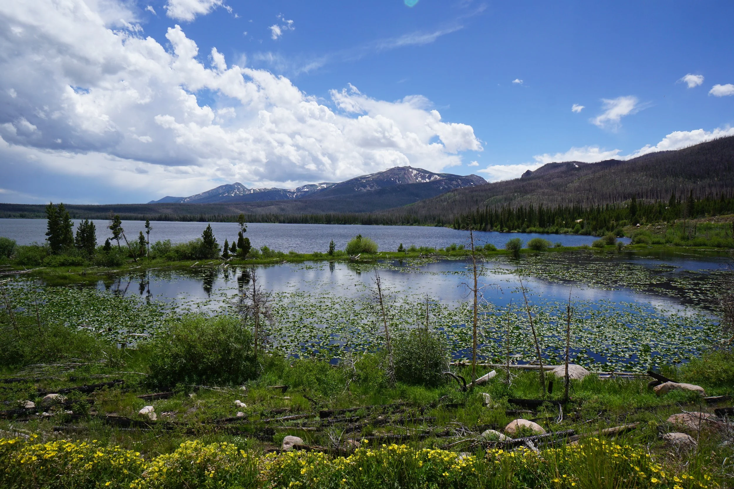 Big Creek Lakes provides a striking contrast. The lake and the Park Range backdrop is absolutely beautiful but the surrounding forests are slowly recovering from massive wildfires. The decimated forests provide a somber contrast to the beauty of the mountain range. This tucked away hidden gem is well worth a visit. There is a large campground that typically has available campsites and far thinner crowds than most lakefront recreation spots. There are a number of hiking options near the lake and the Big Creek Lakes Trail is wonderful but also needs some serious trail maintenance…contrast again…