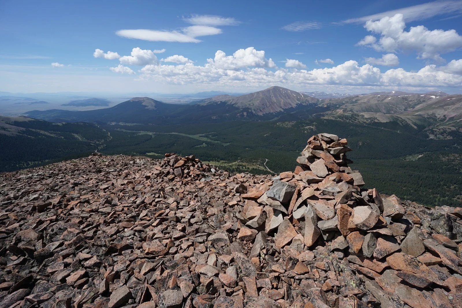 Follow the ridge until the true summit comes into view. Drop down to the gully and hike along the other-worldly rocky section following the trail to the summit. There are cairns and windbreaks at the summit. The views from the summit are nothing short of spectacular. The Tenmile Range, the Gore Range, the Front Range are all on display. However, the most impressive views are the up close look at the twin peaks of Bald Mountain and Mount Guyot...very impressive.
