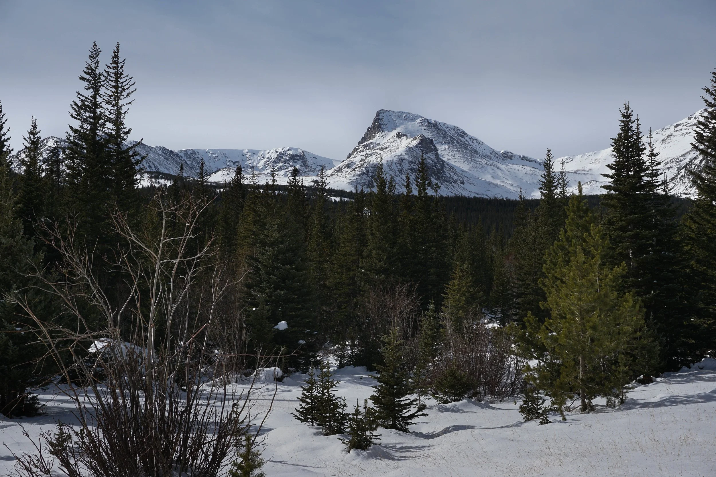 From the Middle St. Vrain trailhead, follow the 4x4 road 1/4 mile to the Buchanan Pass Trailhead. Turn right onto the trail and cross a bridge before turning west and starting the 3.8 mile hike to the clearing. The trail is well maintained and easy to follow. This trail gets a fair amount of traffic so in the winter the trail should be well packed, microspikes are helpful. The trail spends most of the time in the trees and following the creek so be prepared for minimal mountain views for most of the hike. That being said the trail through the forest is pleasant, quiet, and peaceful, especially on a winter morning.
