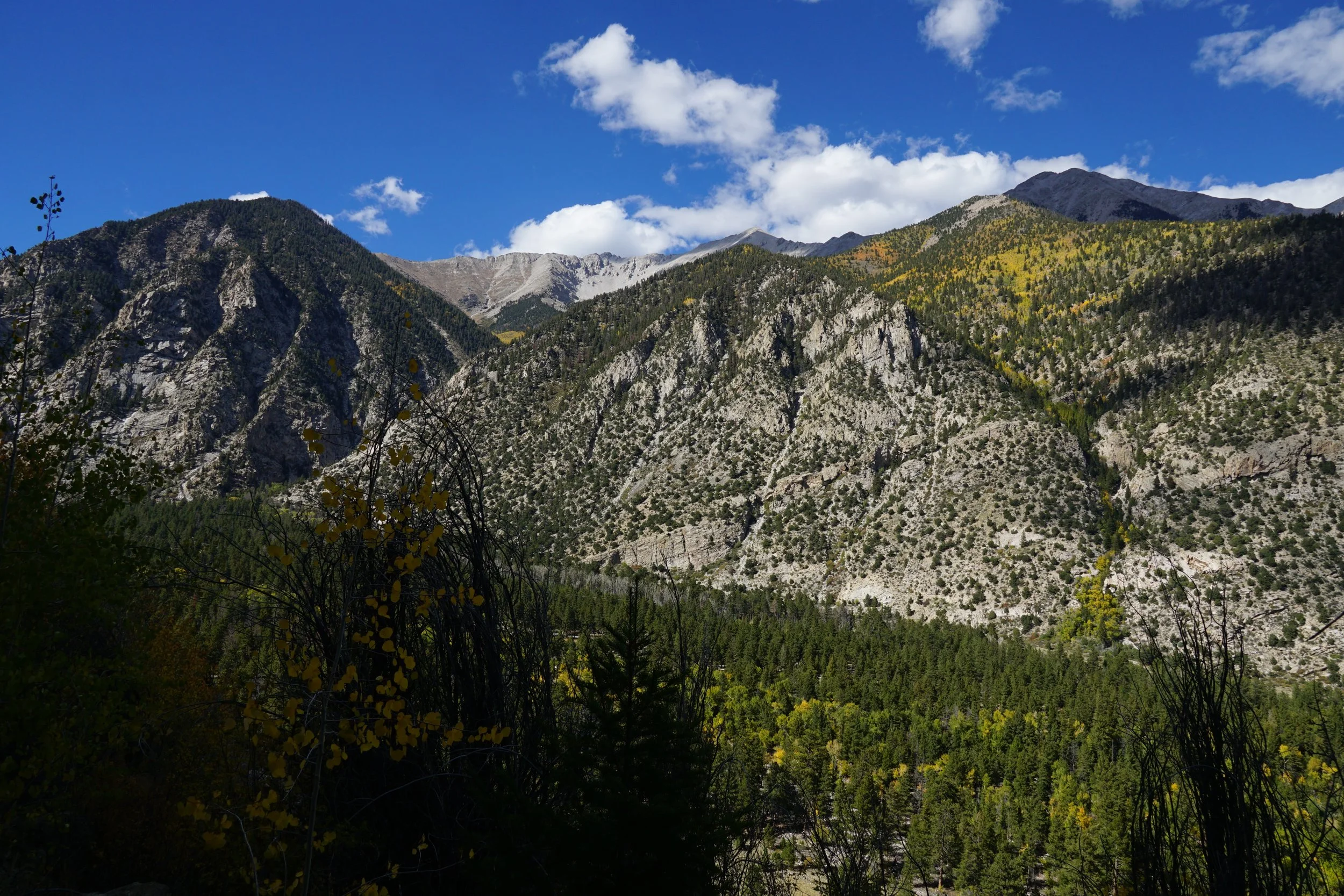 From the trailhead, the hike heads west, the views are immediately incredible. As you hike up the canyon your views of the Chalk Cliffs diminish but your views of Mt. Princeton and Tiger Peak across the valley get better and better. At just about the 1 mile mark, you'll notice a cascading waterfall hidden by Aspen Trees. This waterfall is frozen late into the season.