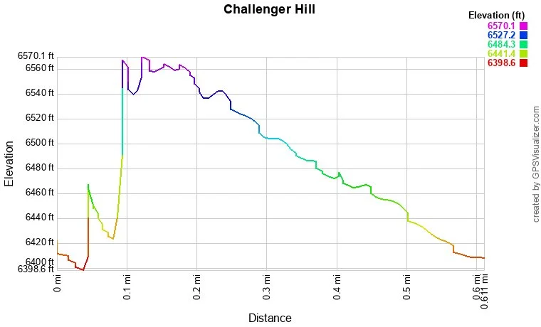 At the top of the incline, a natural surface hiking trail (the Blue Loop) continues along the ridge and begins to gently descend the south and west slopes of Challenger Hill. The hike down is easy, well graded, and has great views south to Pike's Peak. Once you reach the bottom, the trail splits leading back to the base of the incline, or south to access the other hiking loops in the park. The park has an additional 10 miles of trails making up the Red, Green, Gold, and Purple Loops.