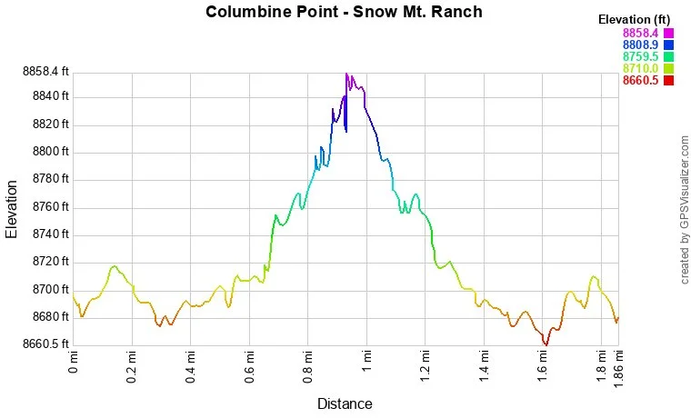 The snowshoe hike to Columbine Point is a nice, short showshoe that will get your blood pumping, even with the minor 200 ft elevation gain (remember that snowshoes basically double your stats, making a 2 mi hike feel like a 4 mile).  From the nordic center, follow the Snowshoe Hare trail to the Milligan Trail,  you'll see signs pointing to Columbine Point.  The destination is a gazebo at the top of  an open sloping meadow with nice views of the surrounding mountains.