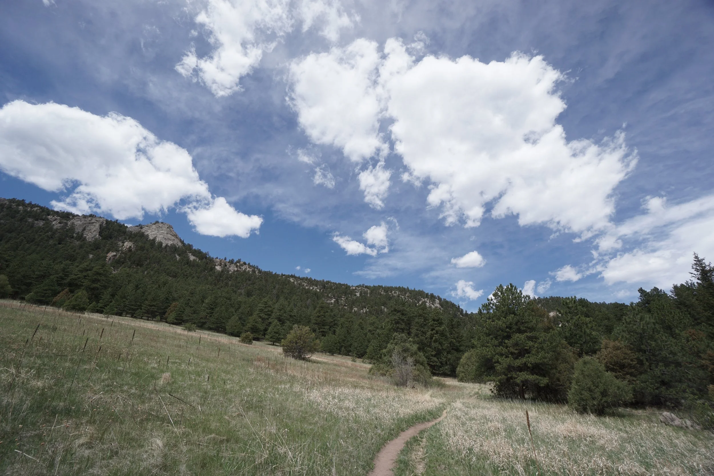 The Coulson Gulch Trail in the Roosevelt National Forest is a lightly traveled forest hike and drops down to a wide open meadow and merges with Longmont’s Button Rock Preserve. The hike is pleasant and the elevation drop is gradual and mild. There are towering rock formations on the west slopes of the gulch that make the hike more scenic than it would otherwise be.