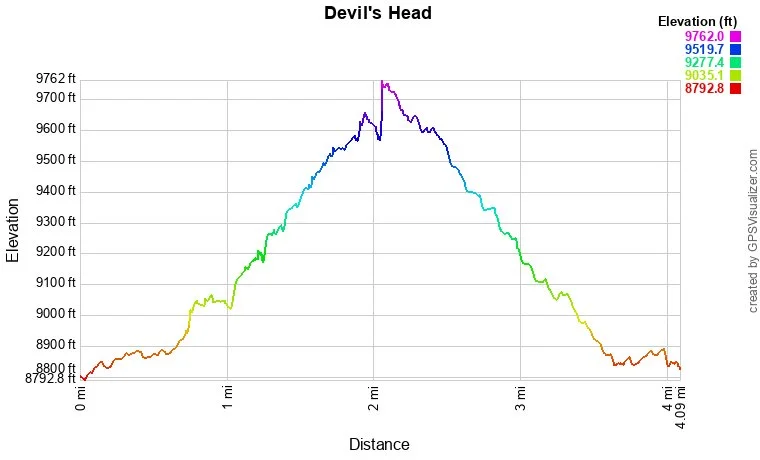 The Devil's Head trailhead is at the end of Rampart Range Road. From Sedalia head west on Jarre Canyon Rd (67) for 10 miles. Make a left on S. Rampart Range Road and travel 8.5 miles to the parking area and trailhead. S. Rampart Range Rd is a dirt road but passable by most passenger cars. In the winter the road is closed approx. 1 mile from the trailhead. This adds a mile of hiking each way but the trail is so short (2.5 mi RT) that it doesn't make much difference.