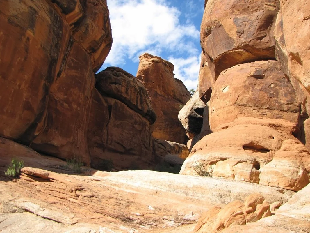 This short but fun hike starts just after entering the park through the East Entrance. Follow the signs pointing to Devil's Kitchen through desert scrub following a small creek. Head towards the rock formations ahead and keep your eye out for the unmarked steps carved into the slickrock on the right. Follow cairns and a faint trail up the slickrock to the towering rock formations. This is the Devil's Kitchen, a shaded flat area surrounded by towering rocks and views out onto Thoroughfare Canyon. This is short but sweet trail but it can be tricky to find the slickrock steps. If you miss the turn off you can still explore the rocky terrain and enjoy the tranquility of the desert.