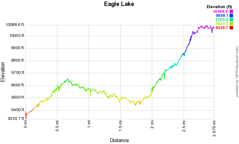 From I-70 exit at the Eagle, CO exit. Follow Eby Creek road south through the town of Eagle and turn right (west) on Grand Ave. Follow Grand Ave for about 1 mile and head south on Sylvan Lake Road. Continue on Sylvan Lake Road and turn right on Brush Creek Road. Follow Brush Creek Road as it enters the White River National Forest and becomes FR 400.2. a good dirt road. The road then enters Sylvan Lake State Park. Stay right at the fork heading towards Sylvan Lake and Crooked Creek Pass. Pass Sylvan Lake and head up 400.2 to Crooked Creek Pass. This part of the drive may be difficult in bad weather. Stay straight on 400.2 at the pass and continue down the southern side of the pass and turn left at FS Rd 507.1 following signs to Eagle Lake. Make another left to stay on 507.1 and follow it to the Eagle Lake Trailhead.