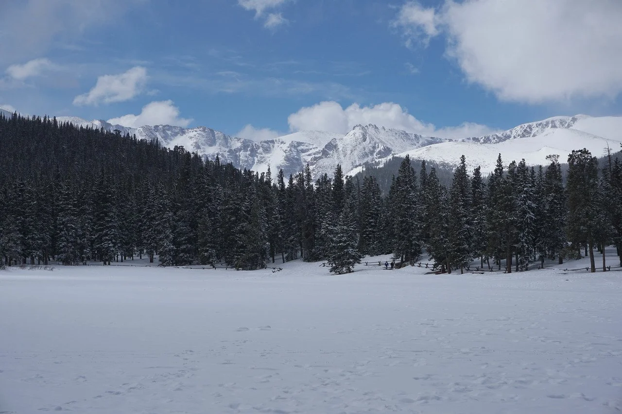Heading clockwise starts you off by following the frozen lake bed along the northern shore. Be very careful here to make sure that the lake is fully frozen. There is no official trail along the north shore so hiking the north shore in winter means that you are hiking over frozen lake and wetlands. The best mountain views can be found along the north shore where Mt. Evans, Mt. Spaulding, and Grey Wolf Mountain dominate the horizon.
