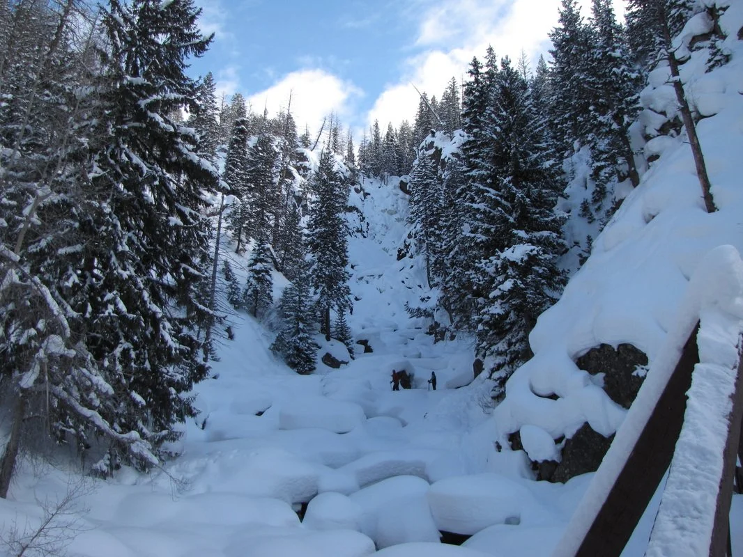 In the winter Fish Creek Falls is a snowy wonderland. The Falls run swiftly below and between tufts of white Champaign powder. The Fish Creek Falls National Recreation Trail runs for 5 miles from the Falls to Long Lake but you can make it much shorter hike and still enjoy the area. I highly recommend using snowshoes on this trail as the snow gets very very deep here.