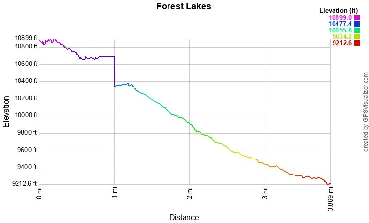 This section of trail follows a creek for a little ways before veering uphill from the creek on a steady climb. Soon some alpine views will become apparent, though largely hidden by the forest. As you get closer to Forest Lake, the trail mellows as you approach he first lake. Lower Forest Lake is large and beautiful with a cascade at the far end. Follow the trail along the south shore of the lake. If you hike this trail early in the season while snow is lingering, you may have some trouble finding your way here. Look for a boardwalk and footbridge at the south western end of the lake if you can't find the trail.
