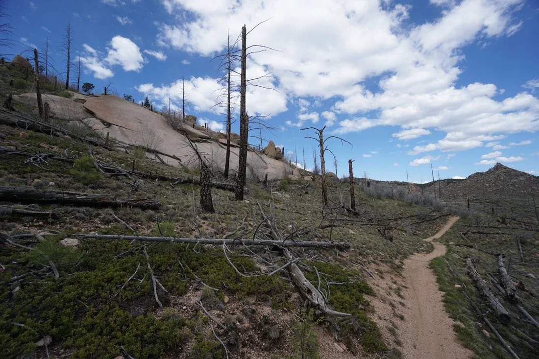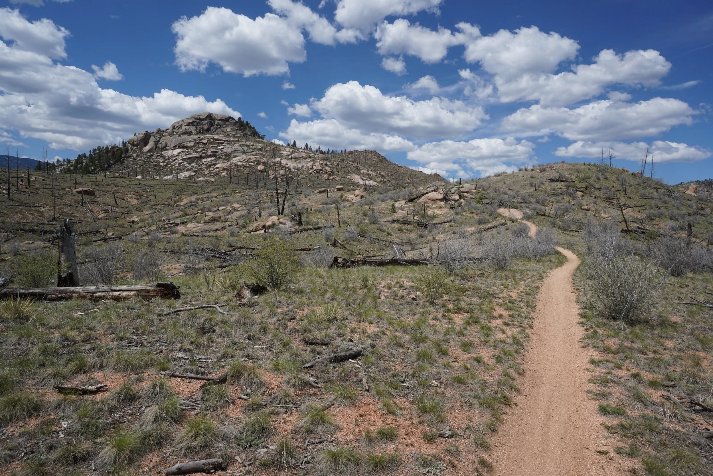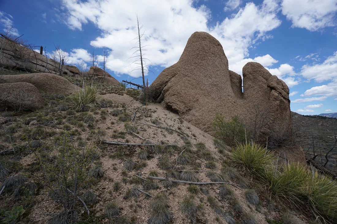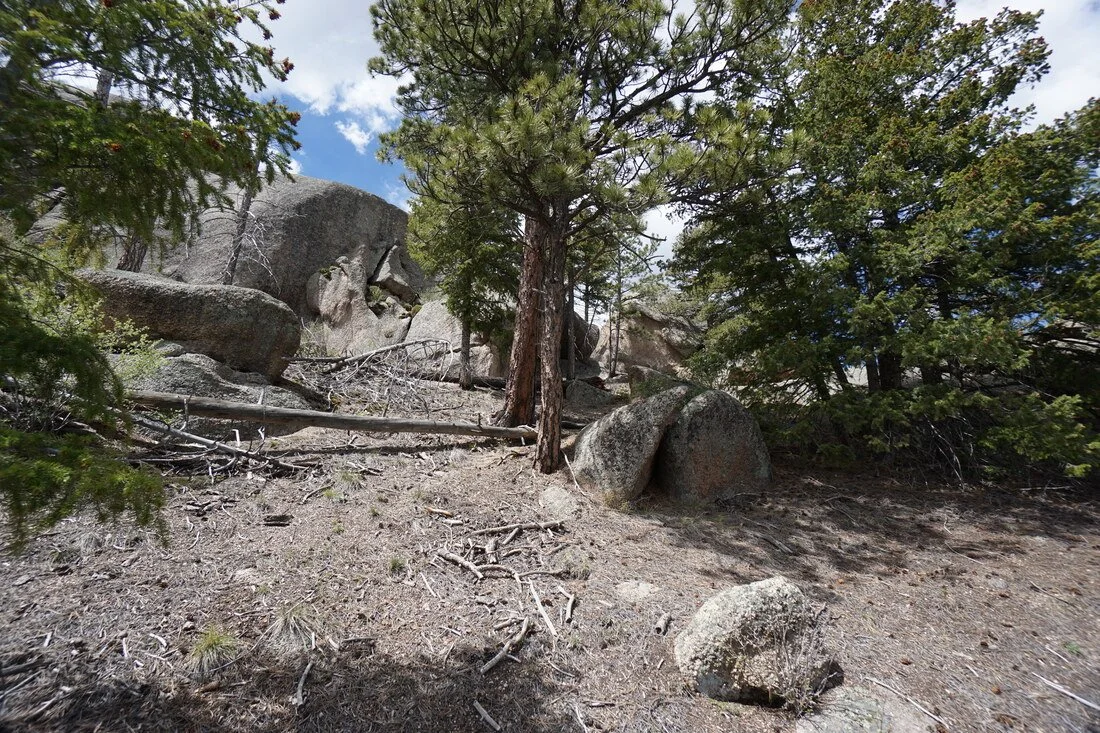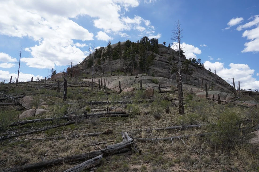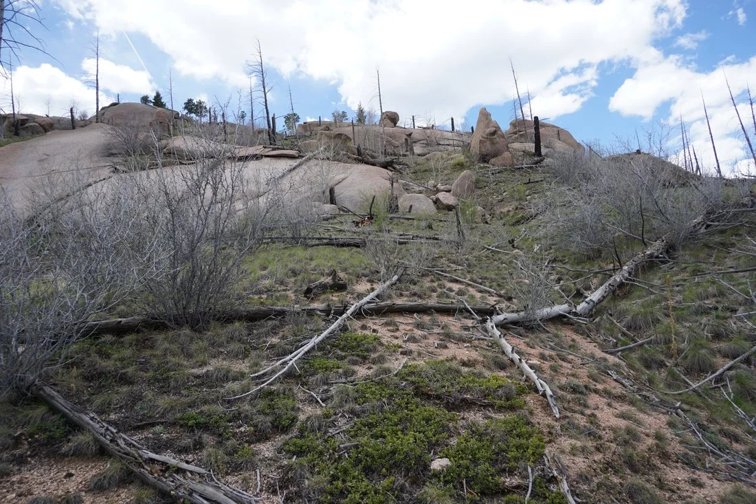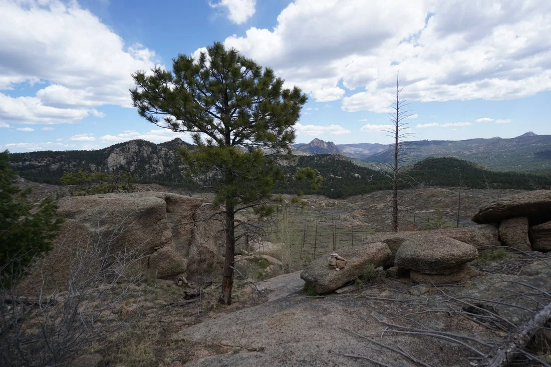 From the large parking area on S. Buffalo Creek Road, start out hiking west along the road that is now closed to motor vehicles. After .6 miles you'll reach the trailhead for the Sandy Wash Trail. The Sandy Wash trail rolls gently through the sparse pine forest paralleling the road for a little while before gaining elevation. Along the way you'll hike past towering boulders and rock formations, with the occasional views of the surrounding area.