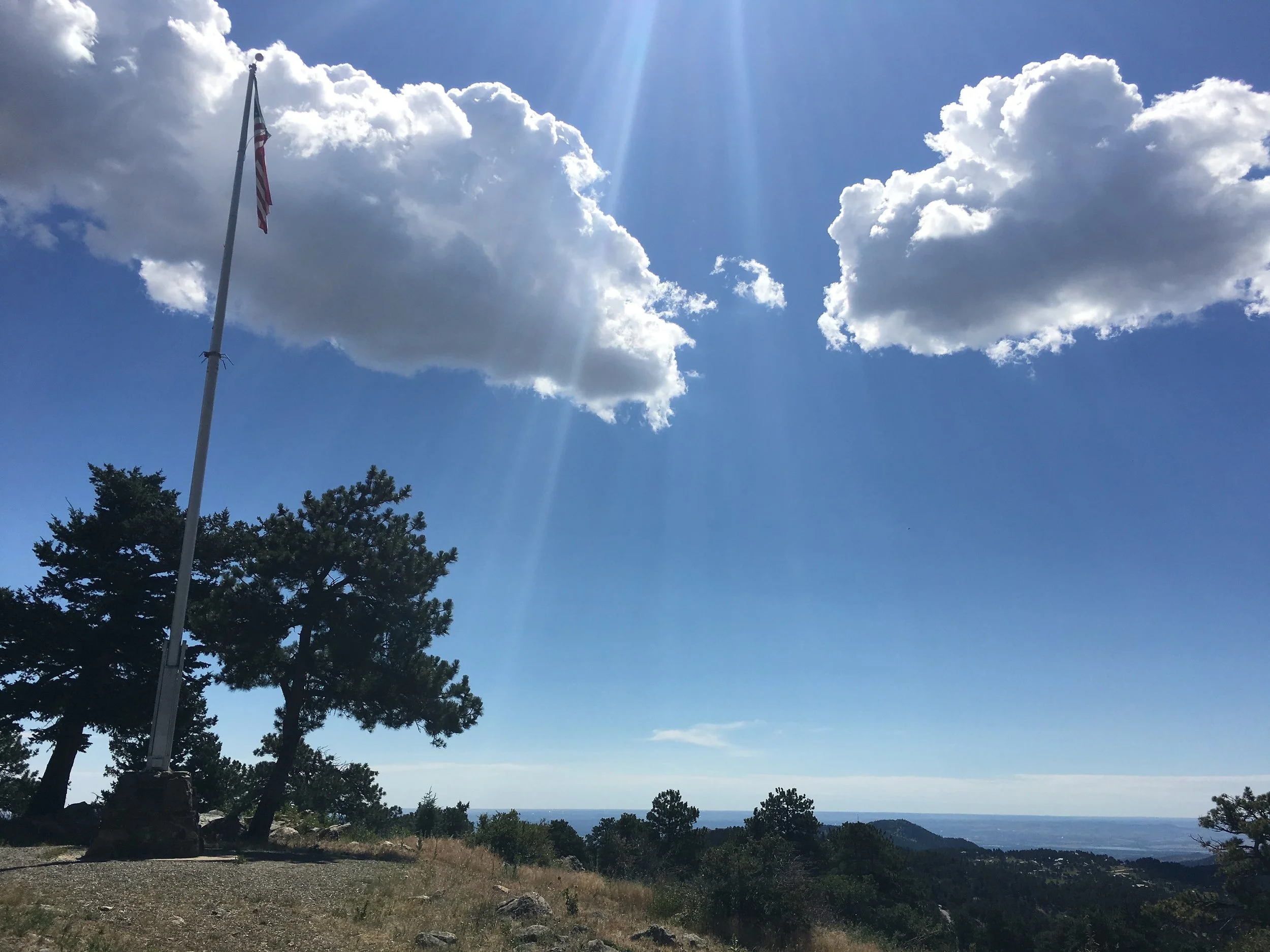 Just before you re-cross Genesee Mountain Road, are the best views, even better than the summit. The views of the Mount Evans Massif are wonderful. Continue up and join the road. Turn right and follow the road to the next trail sign. Follow the trail to the summit and the historic flag pole and memorial. Some short trails lead away from the flag pole to explore more of the small summit area.