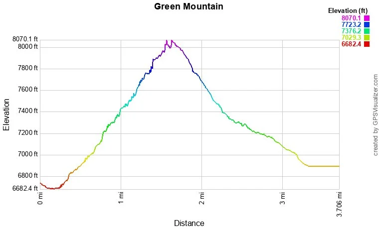 From the parking area head down the side-road to the Green Mountain Lodge and gate. Pass through the gate and head downhill to the Ranger Trail. Follow the Ranger Trail south as it climbs moderately past the Green Mountain Lodge and through thick pine forest to the junction with the E.M. Greenman Trail. Stay straight on the Ranger Trail as it gains elevation and deposits you on the windy ridge line. The views to the west become expansive on this area as it is much more exposed then the rest of the trail. Follow the ridge until the forest envelopes you again and the switchbacks get tighter nearing the summit.
