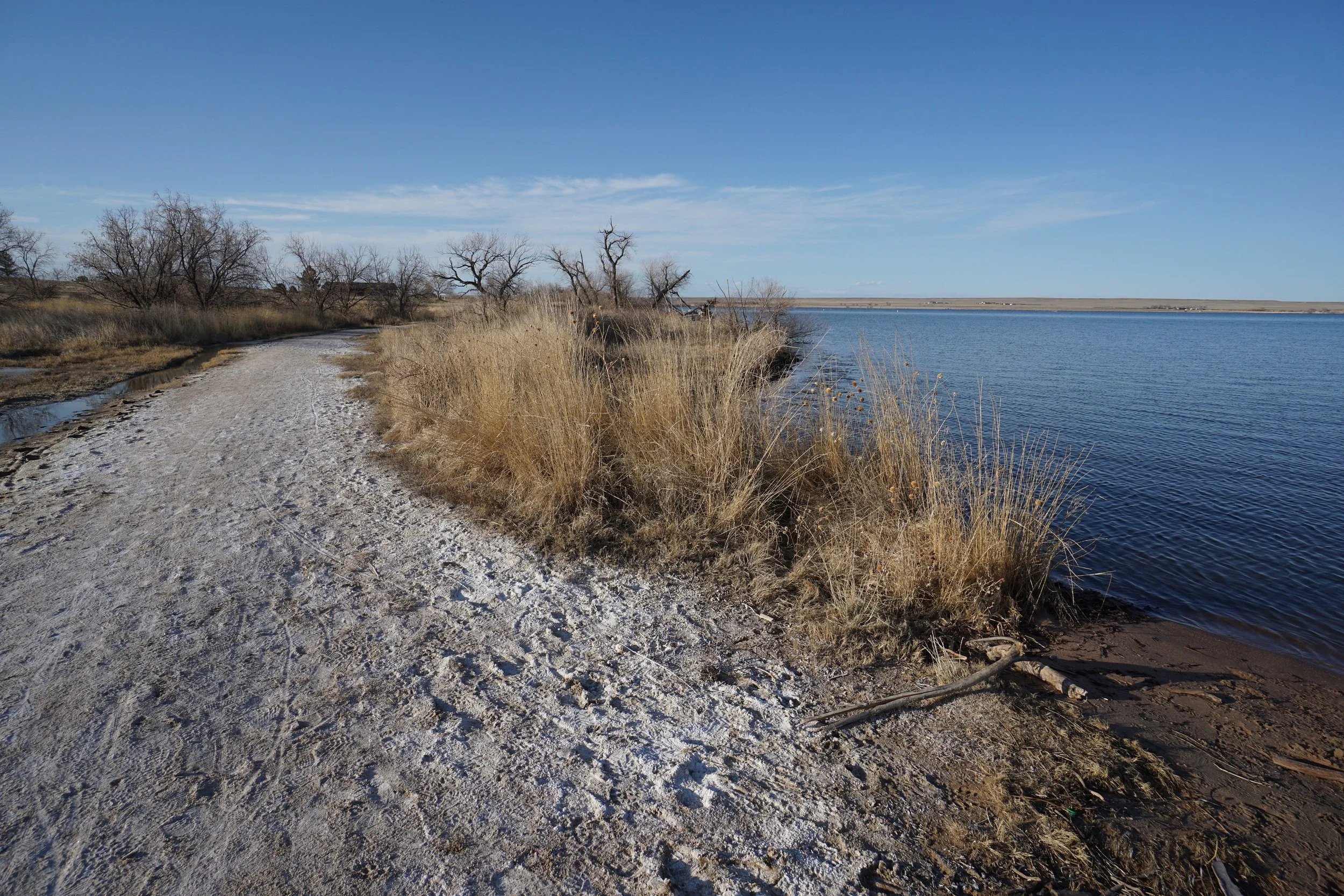 Jackson Lake State Park is not well renowned for it’s hiking trails, but in Colorado’s Eastern Plains, you take what you can get. The North Footpath along the western shore of Jackson Lake is very pretty and when the wind is not howling…makes for a very pleasant hike. The Trail follows the shoreline providing lake access for fishing and other recreational activities. As you head north, the trail enter and cuts through the campground. North of the campground, the trail gains a small hill with a nice viewpoint. If you continue pushing north, you can pass through a gate for a “service road” and enter a more natural open space area. The trail/road travels through a nice grassland and connects to a road that runs along an irrigation ditch, but does not ultimately loop around so you need to return the way you came.