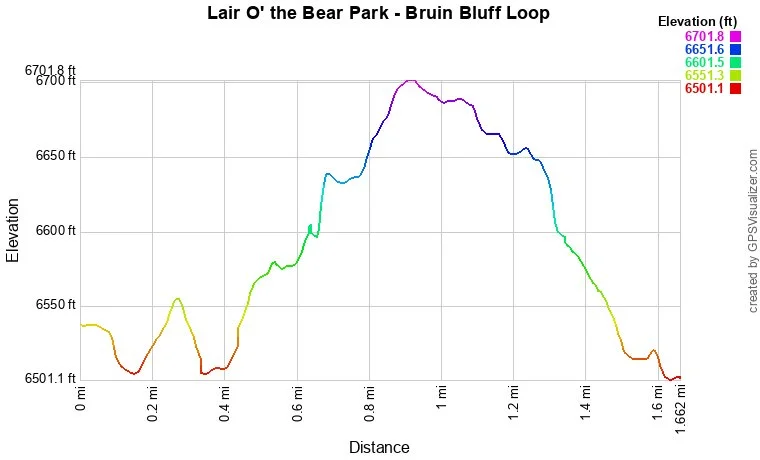 From the parking area start by heading towards Bear Creek and turn left on the Creekside Trail.  You follow Bear Creek for a little ways and eventually are lead to the Ouzel Bridge, next to the outdoor classroom.  Cross the bridge to find the Bruin Bluff Trail junction.  Turn right (west) and follow the Bruin Bluff trail along the north face of Bear Creek Canyon for 1.3 miles before descending back down to Bear Creek.