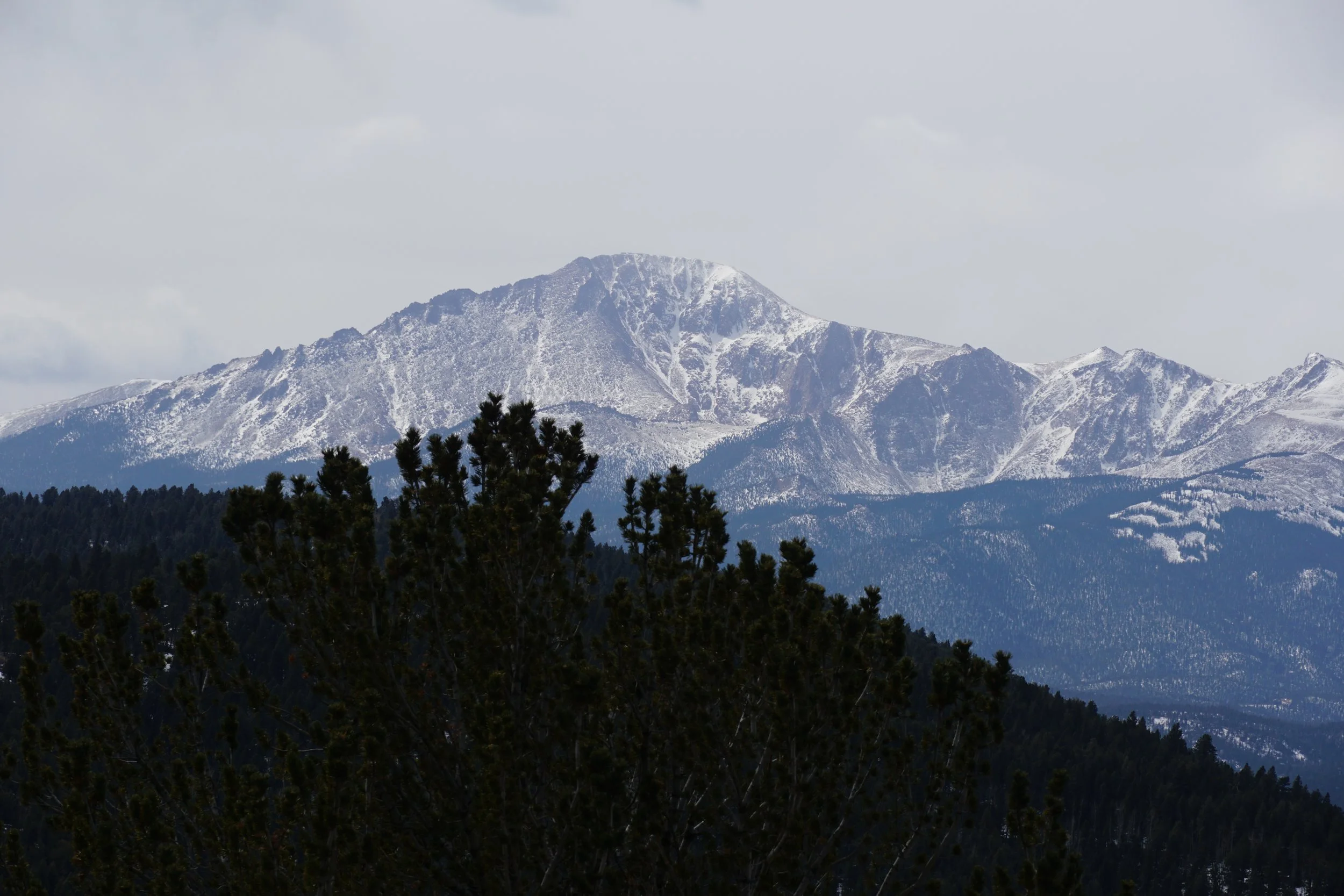 For the first ¾ of a mile, the trail winds through sparse pine forest with aspen trees and groves mixed in. The trail gains about 200 ft in elevation before you reach the actual loop. If you turn left at the loop and follow it clockwise, then you gain about another 300 ft in a bit more than half a mile up to a saddle with good views of Pikes Peak. From the saddle, the trail stays up high in the pine and aspen forest for the next 1 ½ miles and 500 feet of elevation gain. This segment of the trail has some wide open areas with nice views, follows some power lines for a little while, and eventually reaches the upper trailhead.