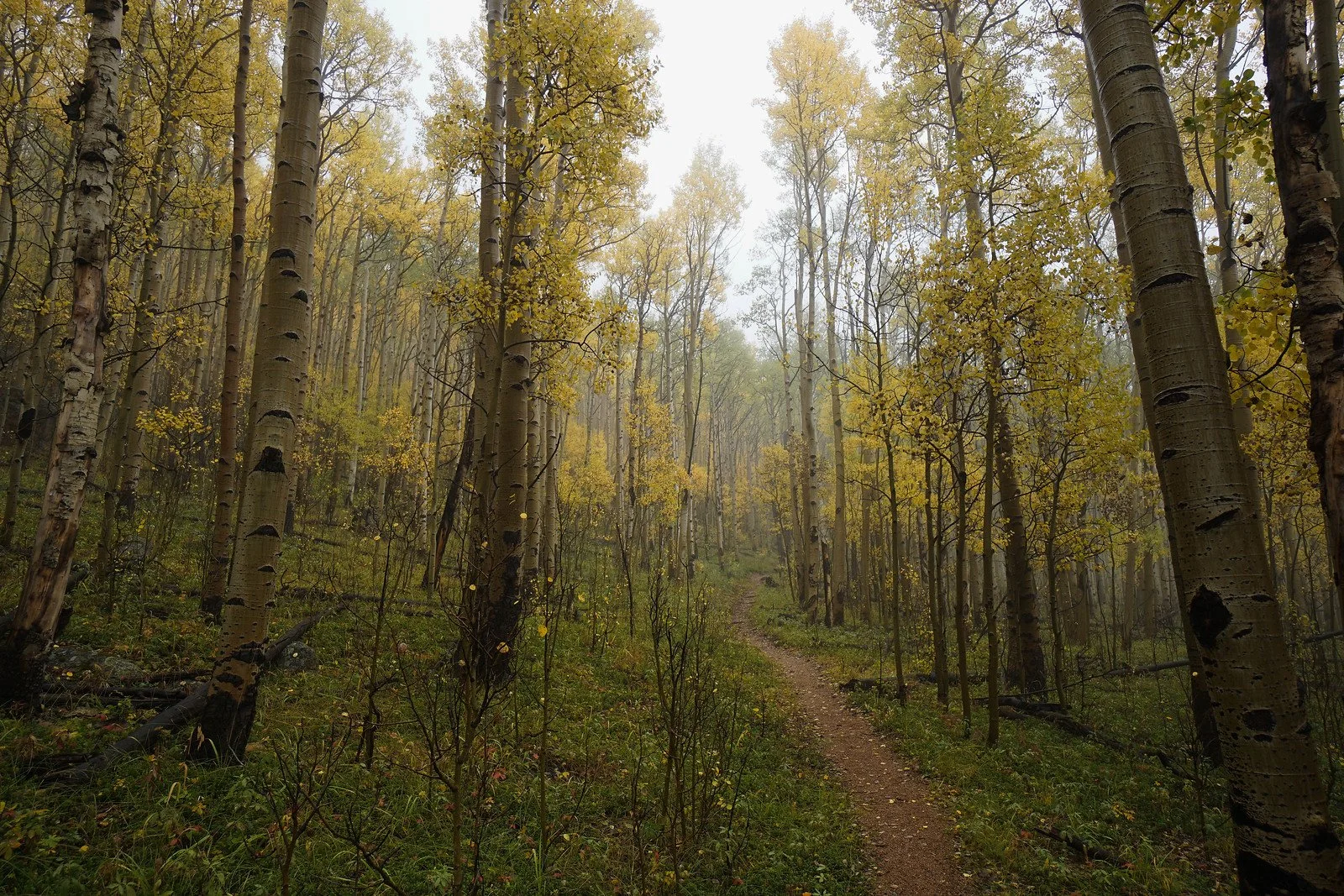 The Meridian Trail is an often overlooked trail that accesses the southern portion of the Mount Evans Wilderness. The trail climbs steadily to a forested saddle before dropping down into the wilderness area by connecting with the Cub Creek Trail. The trail is useful if you want to bushwhack to Meridian Hill (11,490 ft), Mud Lakes, or Rosedale Peak (11,825 ft). However, the trail's main appeal is the 3/4 of a mile long aspen grove about half way up the trail. This trail is perfect for fall hiking. On the day that I hiked this trail the entire Front Range was covered in low hanging cloud so the forest was misty. While the views were virtually non-existent, there were also few hikers and the aspen groves were still spectacular.