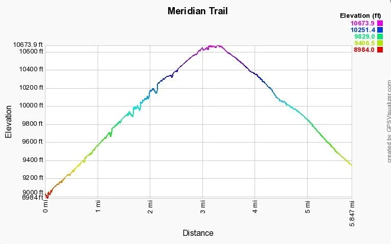 From the Meridian Trailhead, cross the creek and start the steady climb along the eastern slopes above Elk Creek. The trail traverses pine forest with beautiful patches of young aspen. This area was once the site of a forest fire and aspen trees thrive in forests recovering from fires. Wonderful aspen groves are also prevalent along the creek bed bellow and across the valley providing nice views as you hike.