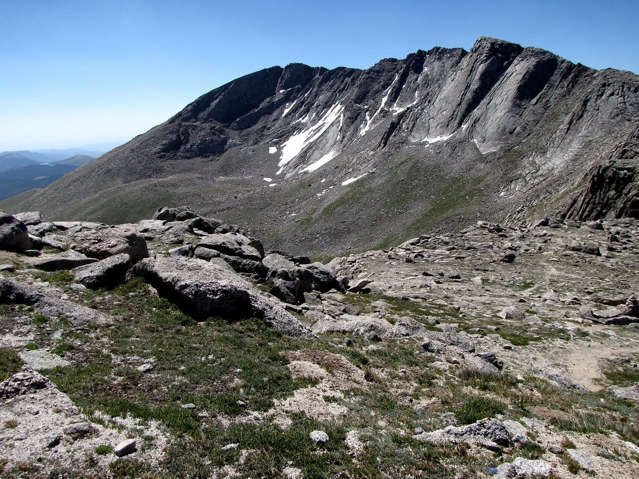 This route to the summit of Mt. Evans starts at Summit Lake (Denver Mountain Park). Summit Lake is the last stop before the summit parking lot on Mt. Evans Road. From Denver take I-70 west to Idaho Springs, take the Mt. Evans Exit south and take Chicago Creek Road to Mt. Evans Road, just after Echo Lake. The road is closed in winter and there is a fee to drive up the road. If you have a National Parks Pass it will work here, even though the area is managed by the U.S. Forest Service, not the National Park Service.