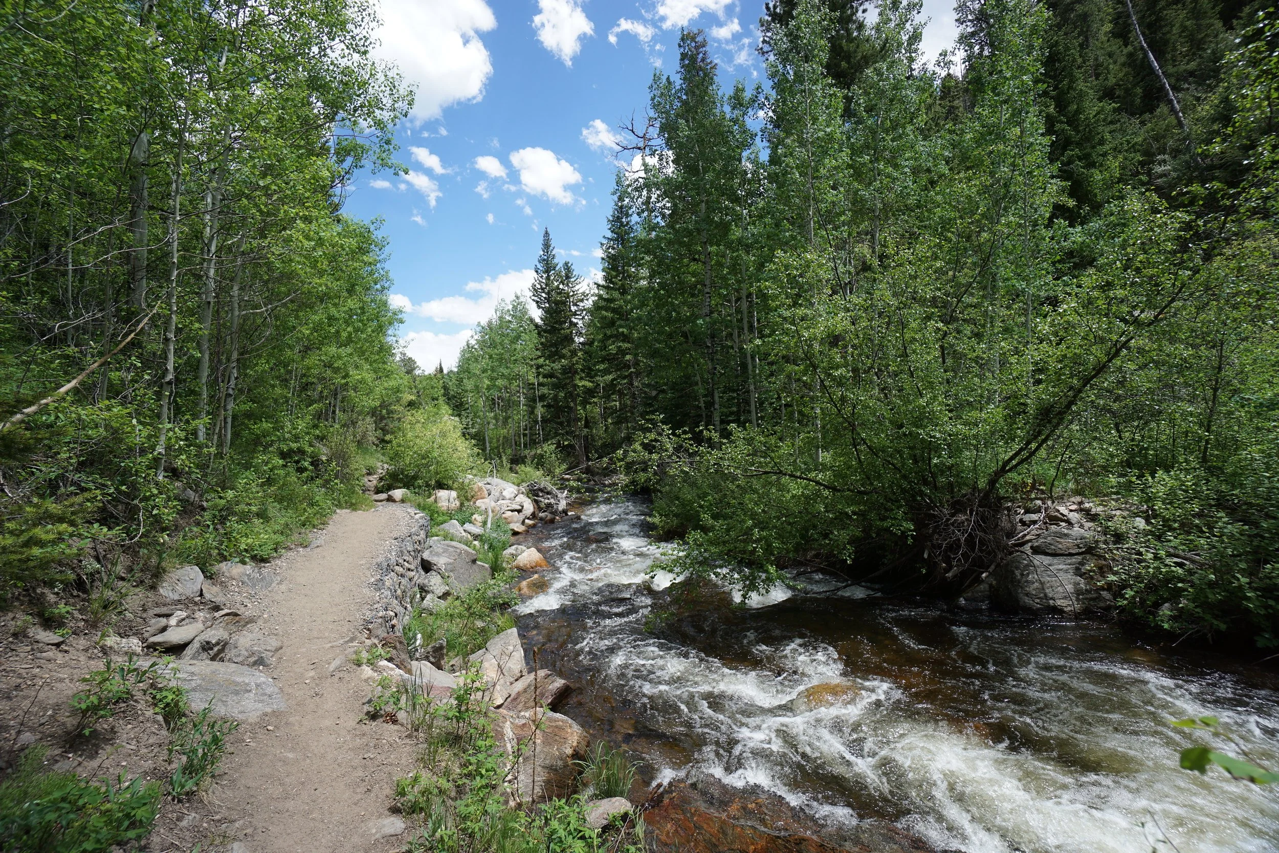 From the parking area, the trailhead is located on the southern end and heads south into the Comanche Peak Wilderness.  The trail quickly heads downhill through pine forest and massive boulders as it approaches the Big Thompson River.  Once you reach the river, the trail rambles through aspen forest (should be amazing in the fall) as it follows the cascading river for the next mile.