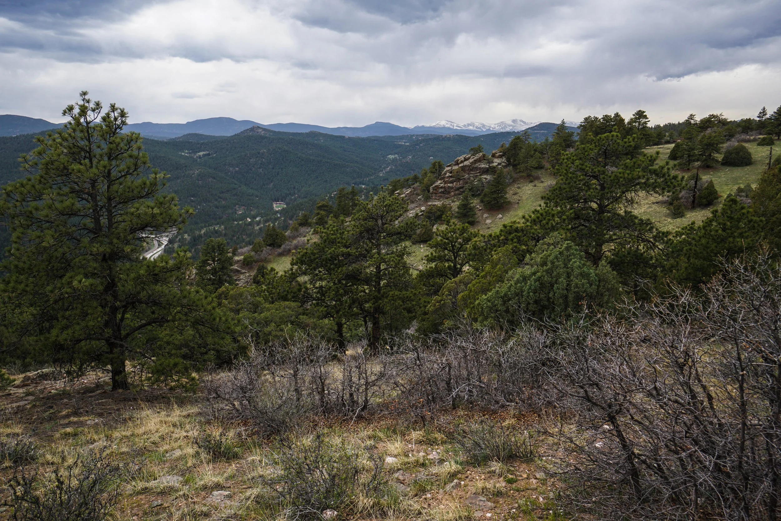 If you turn right, you will come to two loop trails, I usually take the right forks each time, first on the Ute trail and then on the Devil's Elbow Trail. This trail gains more elevation and provides you with a fantastic view of Mount Evans if the weather is clear. When you get to the southern end of the Devil's Elbow you again get a great view of Mt. Lindo and the Great Plains. Follow the trail back north through thick forest until you close both loops. From here it is about a mile back to the trailhead and you get to hike next to the burn area before reaching the trailhead.