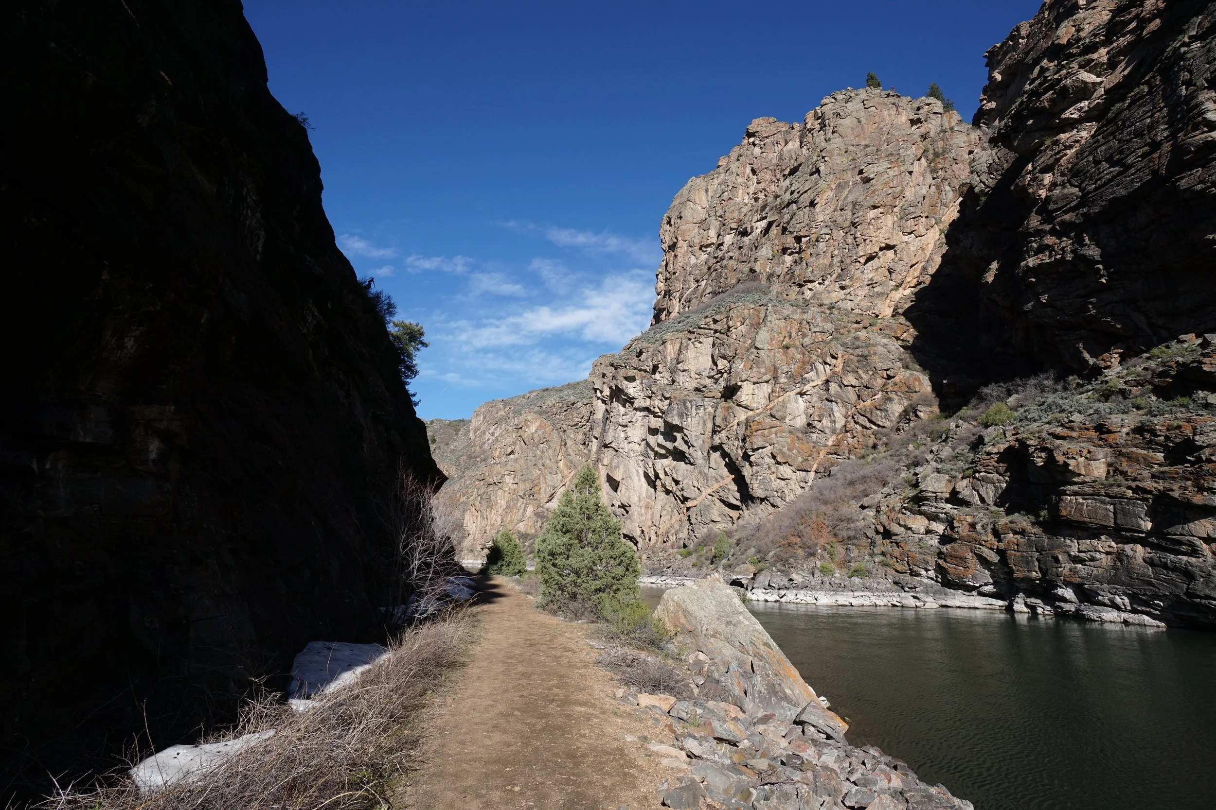 The trail continues past the boat launch for another .4 miles and explores more of the canyon before it ends and rocky boulders (which may or may not be covered by water) obstruct your way.