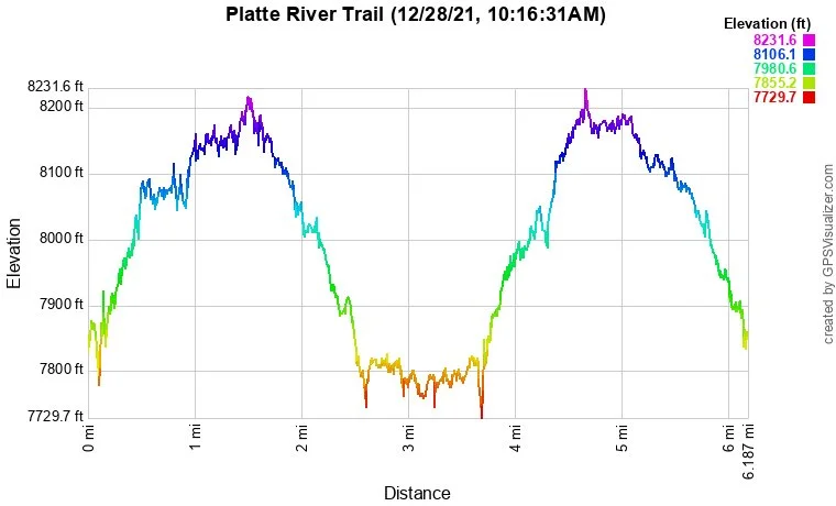 The trail starts off by steadily climbing up the hillsides through pine forest with nice views of the gentle canyon formed by this section of the Platte River. After about 1 ½ miles of forested uphill hiking, the trail drops down to the river, losing about as much elevation as you have gained. The hike then follows the river banks for as long as you want it to. According to the maps, the trail follows the river for 1 ½ miles before stopping and climbing up to the Platte Springs trailhead. I hiked the river for about half a mile before turning back at a good viewpoint. The return hike has the same up and down profile as the hike out to this point so be sure to save yourself a bit of energy.