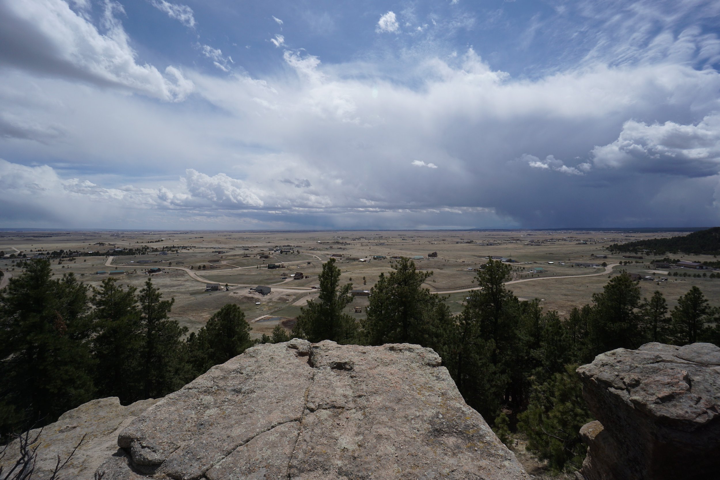 As you follow the trail, you'll soon reach the overlook and you'll know it when you see it. The overlook is a large clear area with a sharp cliff face and a view stretching all the way to Pike's Peak and the Southern Front Range Mountains. This is a stunning spot and would be an amazing place to watch the sunset. The trail continues to follow the edge of the bluff past the overlook. If you are following the single track then it will join up with some power lines and return to the main trail near the junction with the Homestead Ranch Trail. The main trail does the same, just a hundred feet or so to the east.