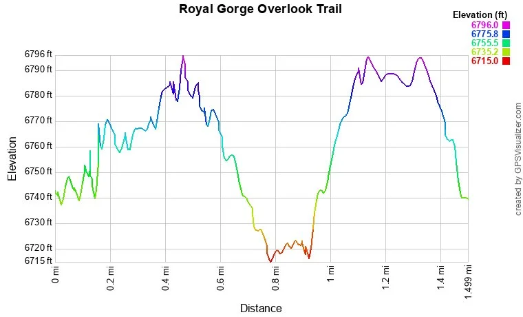 The Overlook Trail starts across from the rest area just before the Elkhorn Day Use Area Road. Turn right at the sign for Canyon Rim/Overlook Trails and start heading up the gentle slopes to the first viewpoints. Your first views will be of the canyon heading back to the east. These views are spectacular and will make you forget that you came to see the bridge. The trail continues along the canyon rim, high above the Arkansas River, leads to the Overlooks Loop. If you stay straight at the Loop Junction you'll be treated to more canyon views to the south and west. When you reach the western-most point of the loop, you can see the Royal Gorge Bridge below. The remainder of the loop travels through pleasant spruce, juniper, and scrub oak forests as you return to the trail junction and the rest area.