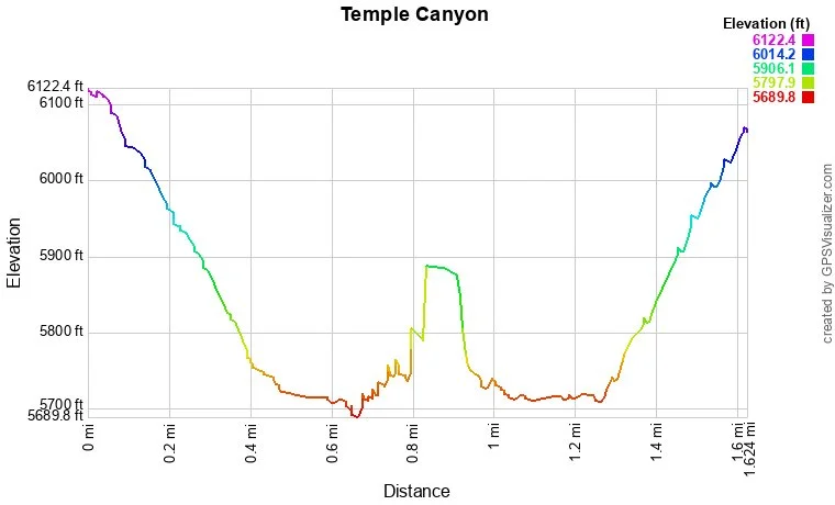 The trail to "The Temple" is a mini religious experience. The trail is short (less than 2 mi round trip) but it does descend and regain about 600 feet of elevation, making it more than just an easy nature walk. Temple Canyon itself is incredibly beautiful as is Grape Creek and the oasis that the trail traverses as the bottom of the canyon. The Temple is a grand amphitheater tucked away in a narrow rocky canyon and entering the canyon feels like you are entering sacred ground.