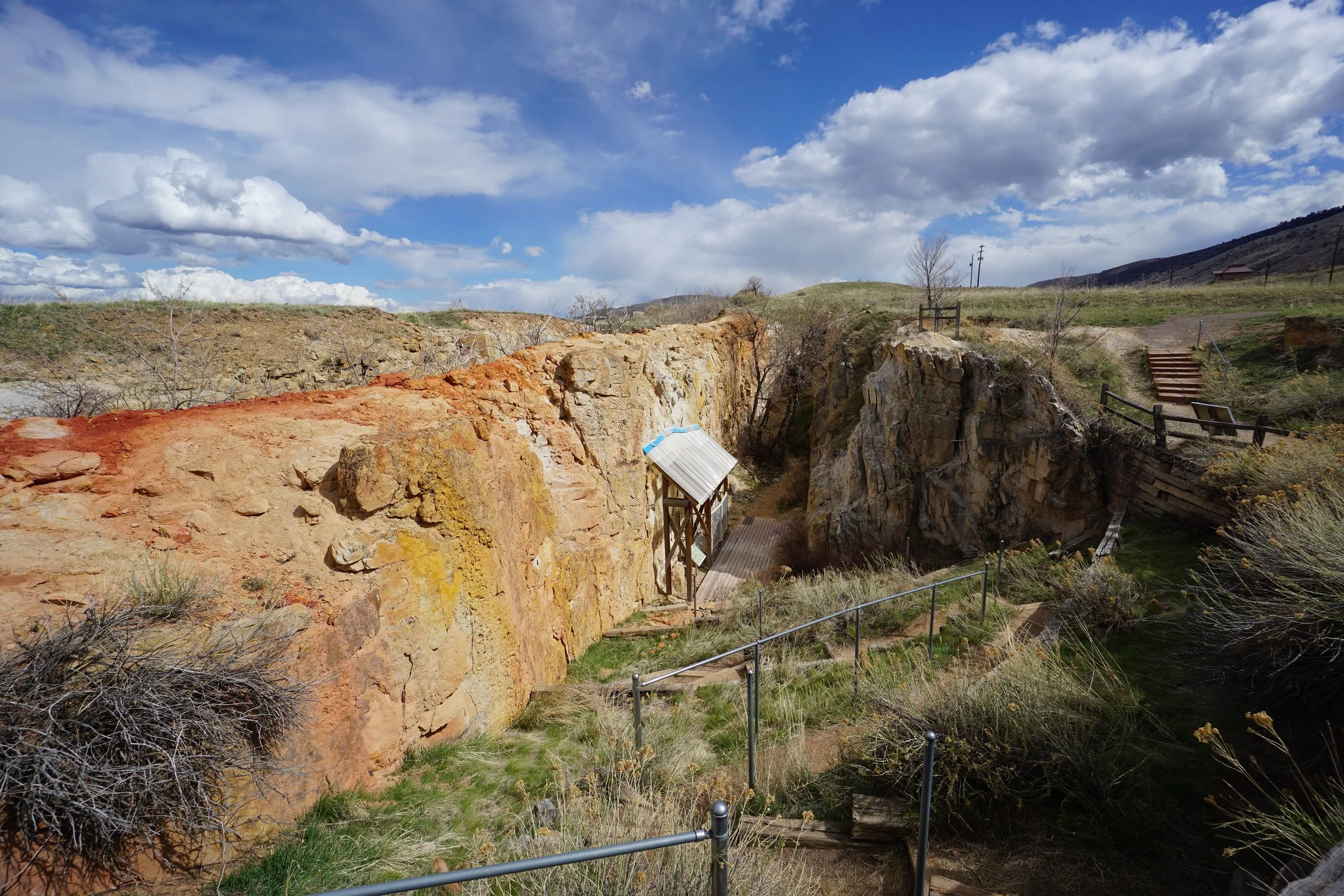 The trail starts along a paved road and becomes gravel and natural surface as you head towards the golf course. There are signs that point the way and take you down to a deep cut in the bedrock. The trail follows the ridge of this cut and leads to an exposed rock wall with the fossils and interpretive signs. The hike is short and easy and extremely educational. Kids and adults alike will find the fossilized remains fascinating and enjoy taking a walk back in time to Colorado’s ancient past.