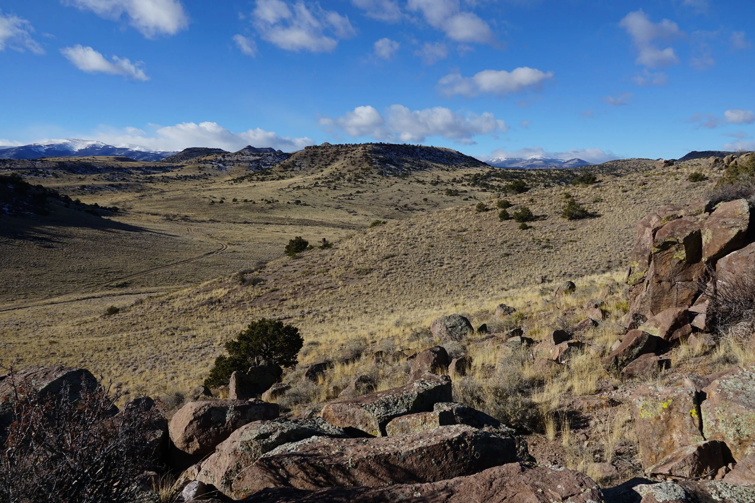The hike starts off along the Stone Quarry Trail and quickly gains some elevation; views of the Sangre De Cristo Mountains across the San Luis Valley are immediately impressive. After just a few minutes of hiking, turn left onto the Vision Quest Trail. The next half mile of hiking zig zags up the eastern slopes of a small hill and reaches the rocky edge where the hill steeply falls away and presents some impressive views of the area to the west leading to the Rio Grande National Forest and the San Juan Mountains foothills. The western foothills views get better and better over the next half mile until the trail turns back to the east and rejoins the Stone Quarry Trail. Turn right on the Stone Quarry Trail to return to the trailhead, or left if you want to extend your hike and explore further.