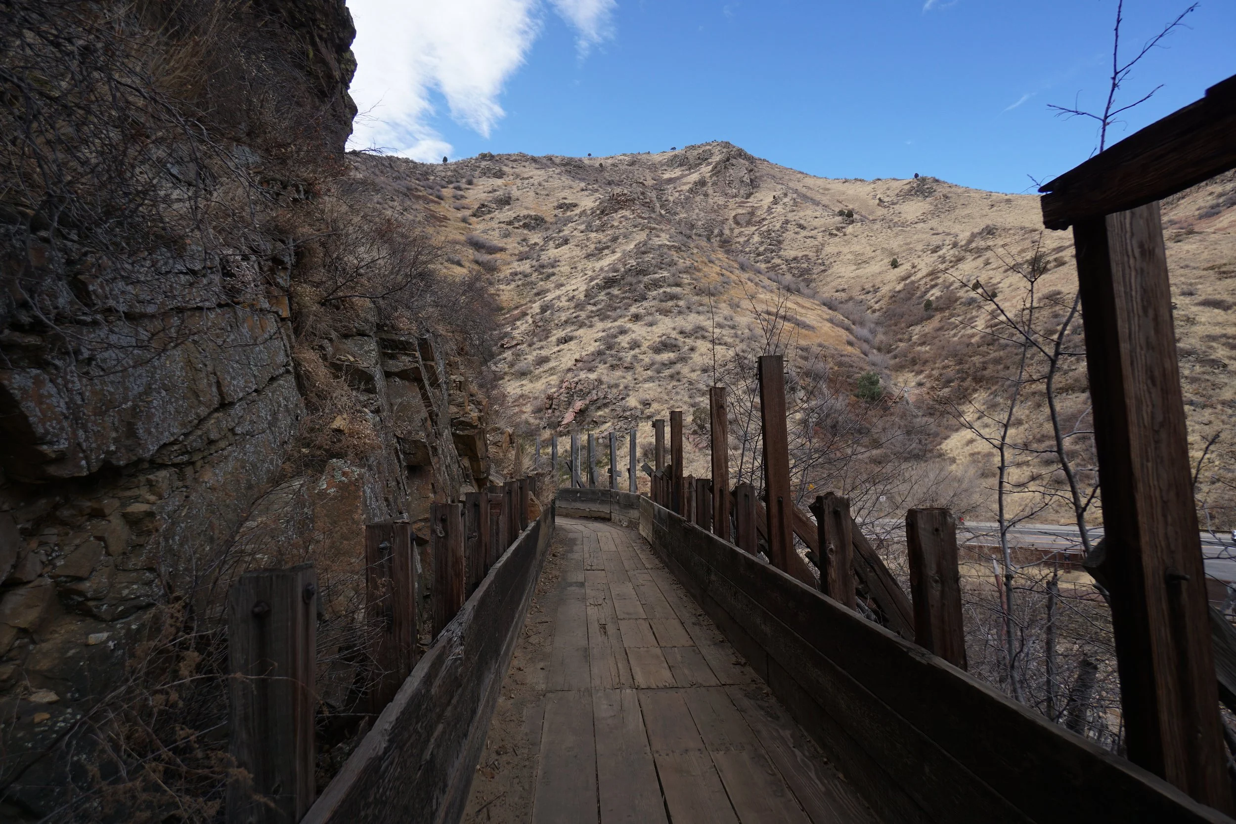 This next part of the trail is relatively flat and follows the canyon for more than half a mile. From time to time, the trail follows the historic wooden water flume, which used to supply Golden and Denver with drinking water. Interpretive signs along the way tell you a little bit of the history. Although reconstructed, the old wood timbers are fun to hike on. The views up the canyon are wonderful and the views back towards Golden and South Table Mountain's Castle Rock are also terrific, especially in late October when Clear Creek is lined with fall colors.