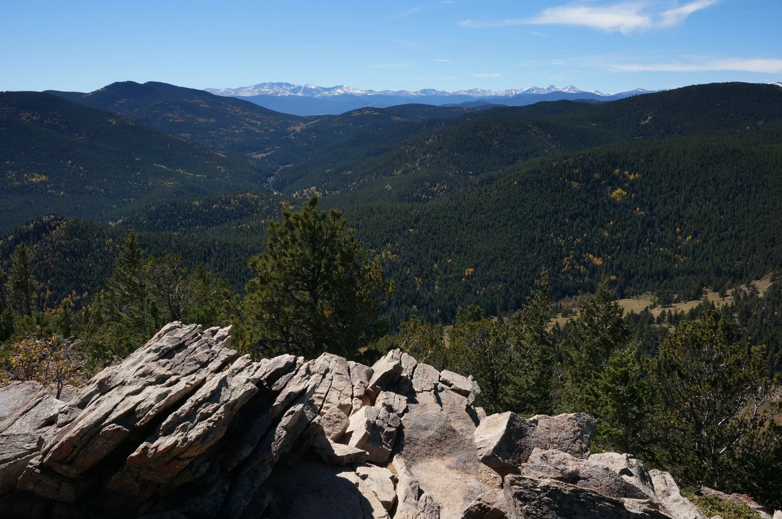 Windy Peak is a forested peak with a rock outcropping offering a terrific view of the Park with the high peaks along the Continental Divide as a backdrop.  You can get there via the Mountain Lion Trail, the Burro Trail, or a combination  of the two.  This description is a combination as the western portion of the Mountain Lion trail was closed at the time.  Either way you go, the hike has a little of everything; evergreen forests, aspen forests (beautiful in the Fall), open meadows, rock formations, etc...